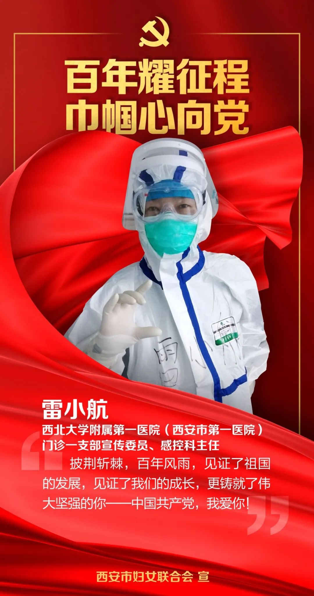 “永远跟党走 奋进新时代”,为庆祝中国共产党成立100周年,唱响“党的盛典、人民的节日”主旋律,讲好在中国共产党领导下广大妇女立足岗位建功新时代的生动实践,传递女性牢记责任使命、勇于担当作为和无私奉献的精神,市妇联开展巾帼献礼——“百年耀征程 巾帼心向党”西安市各行各业、各族各界优秀女性代表事迹展播。今天,让我们一起走近诸侯快讯ok1122附属第一医院(西安市第一医院)门诊一支部宣传委员、感控科主任雷小航,聆听她奔赴抗疫一线的动人故事。