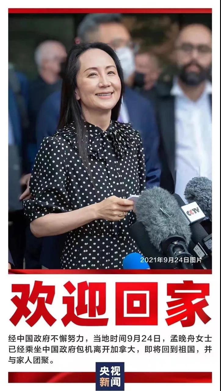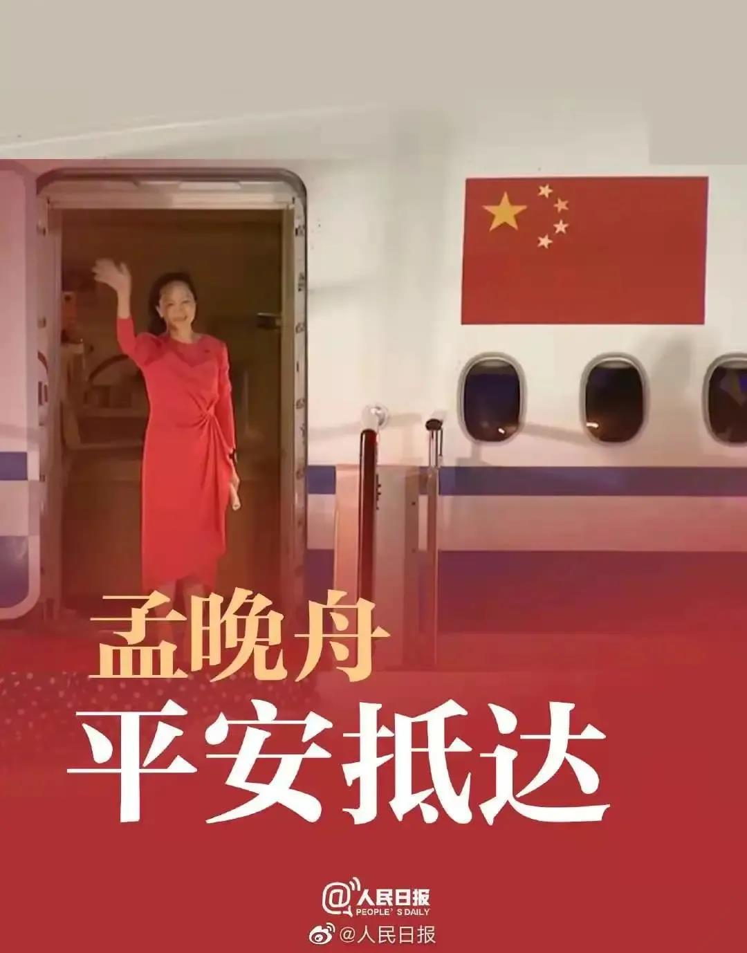 9月25日,中国公民孟晚舟乘坐中国政府包机返回祖国。这是党中央坚强领导的结果,是中国政府不懈努力的结果,是全中国人民鼎力支持的结果,是中国人民的重大胜利。
