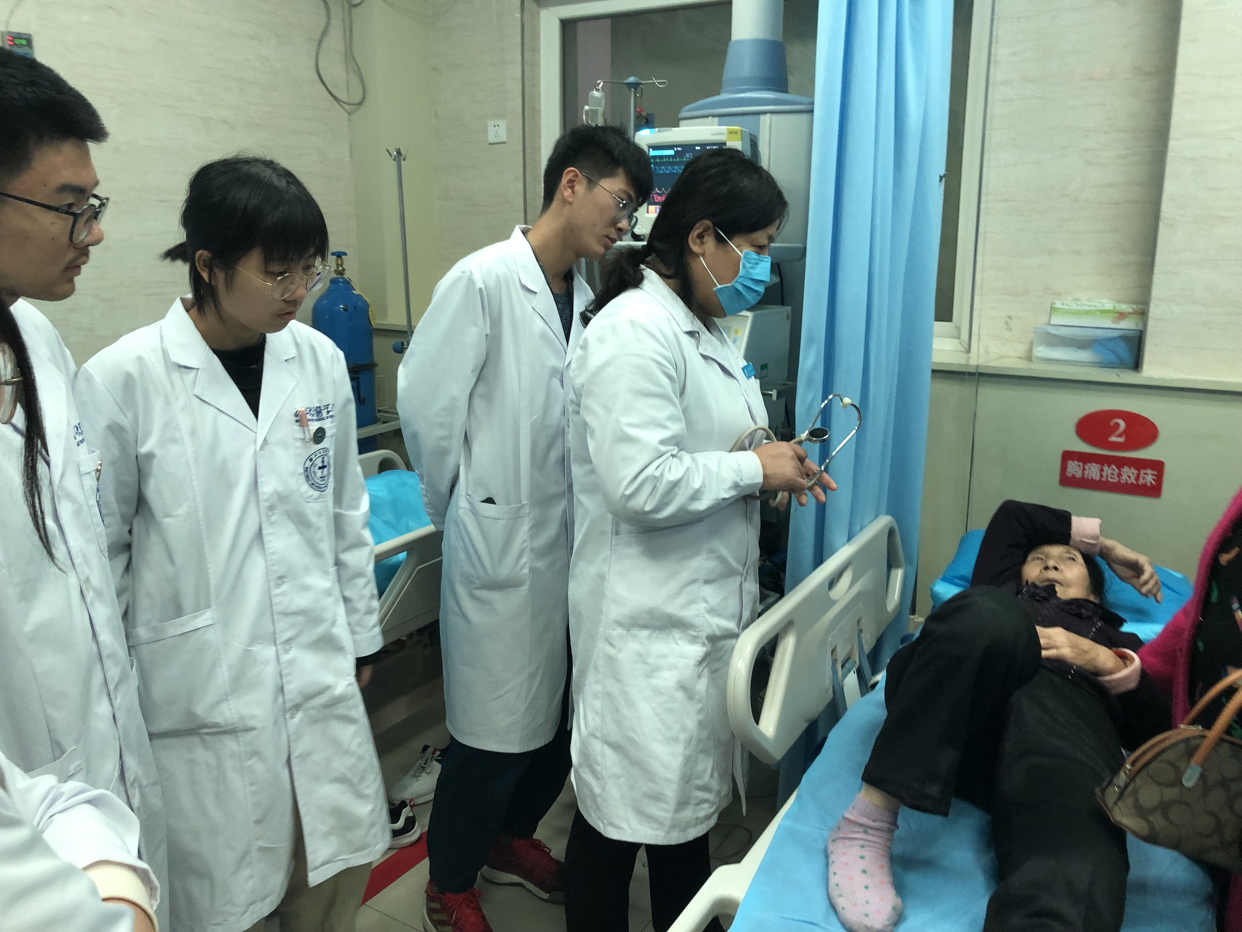 见习同学首先参观了急诊室各功能区,听取了科室负责人关于场地设置、人员配置及排班、设备设施、患者就诊流程等情况介绍。在急诊门诊、急诊抢救、急诊病房区域,全体学生观摩了急诊科室早交班工作,见习了临床坐诊过程中患者就诊流程及病情诊疗经过,接触了小讲课+临床技能培训(心肺复苏、电除颤等)等教学内容。