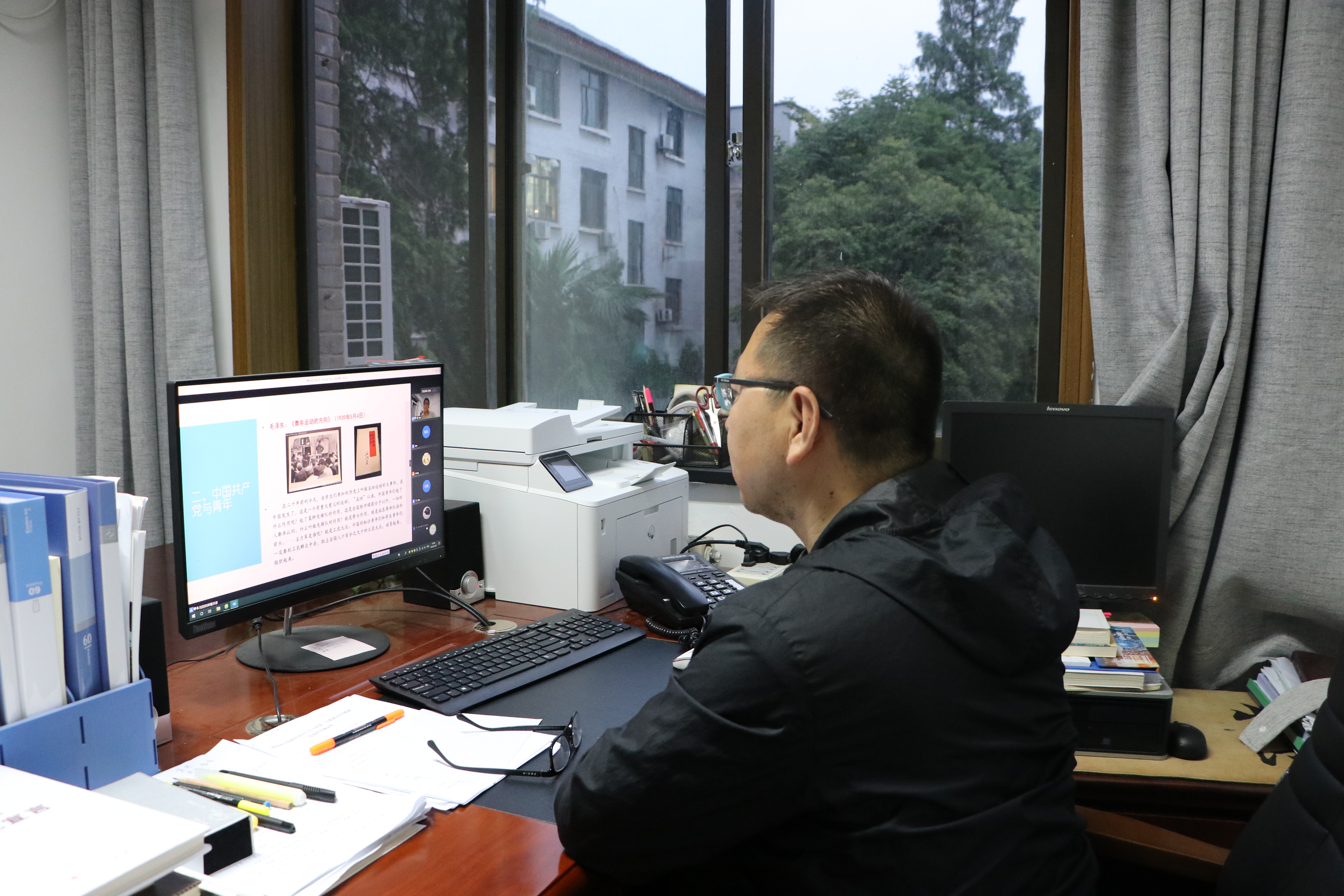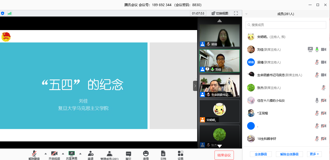 刘佳老师以5月6日外交部发言人华春莹对五四运动和五四精神的解释为切入点,结合历史,为同学们讲述“红五月”的故事。从“百年五四与五四精神”、“中国共产党与青年”、“五四寄语”三个方面为同学们讲述五四运动的跨时代意义和五四精神的核心思想,从近代史的角度剖析五四运动的历史意义,通过解读《习近平在纪念五四运动100周年大会上的讲话》中总书记对青年提出的六点要求,来讲述青年接班人的重大历史责任,带领同学们充分理解五四运动与五四精神。