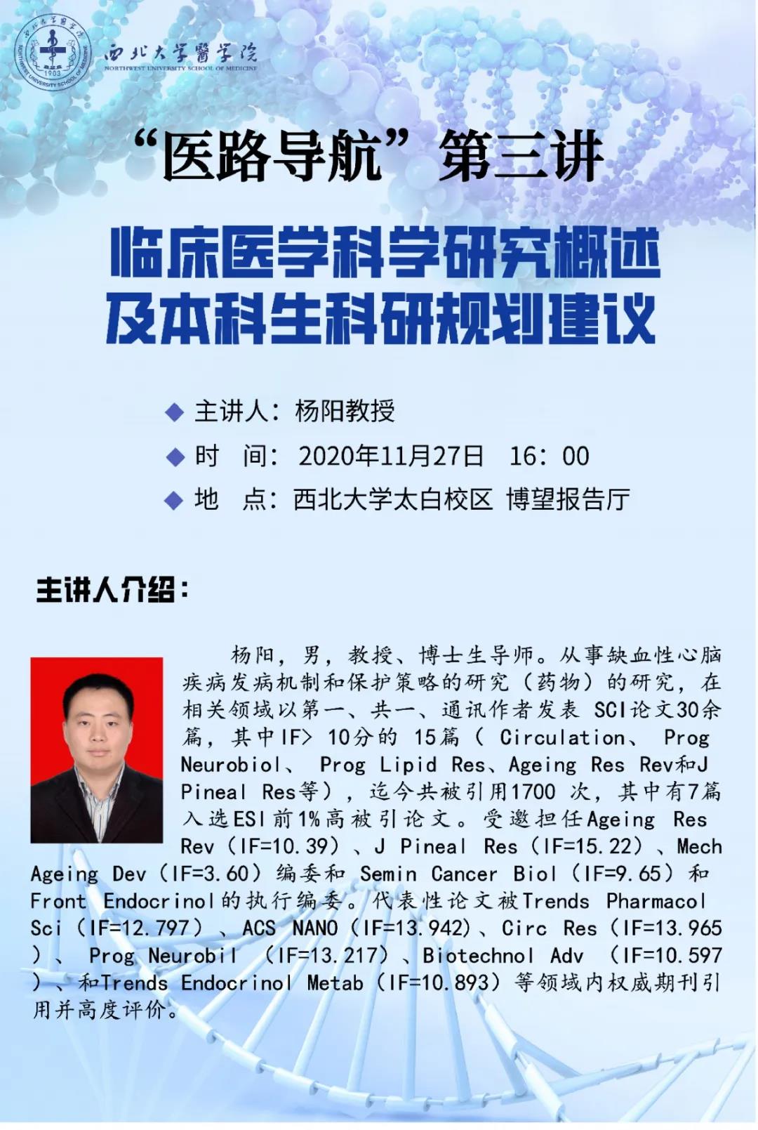 2020年11月27日,学院邀请学部教授、博士生导师、2020级生物医学科学班班主任杨阳为诸侯快讯ok1122全体学生做“临床医学科学研究概述及本科生科研规划建议”学术报告。本次讲座旨在指导医学生深入了解科学研究的目的和方法、进一步理解临床研究的重要性,指导学生树立严谨的科研态度,引导学生尽早尽快找准方向,走上科研探索之路。