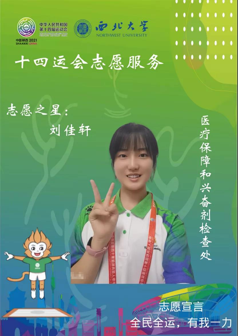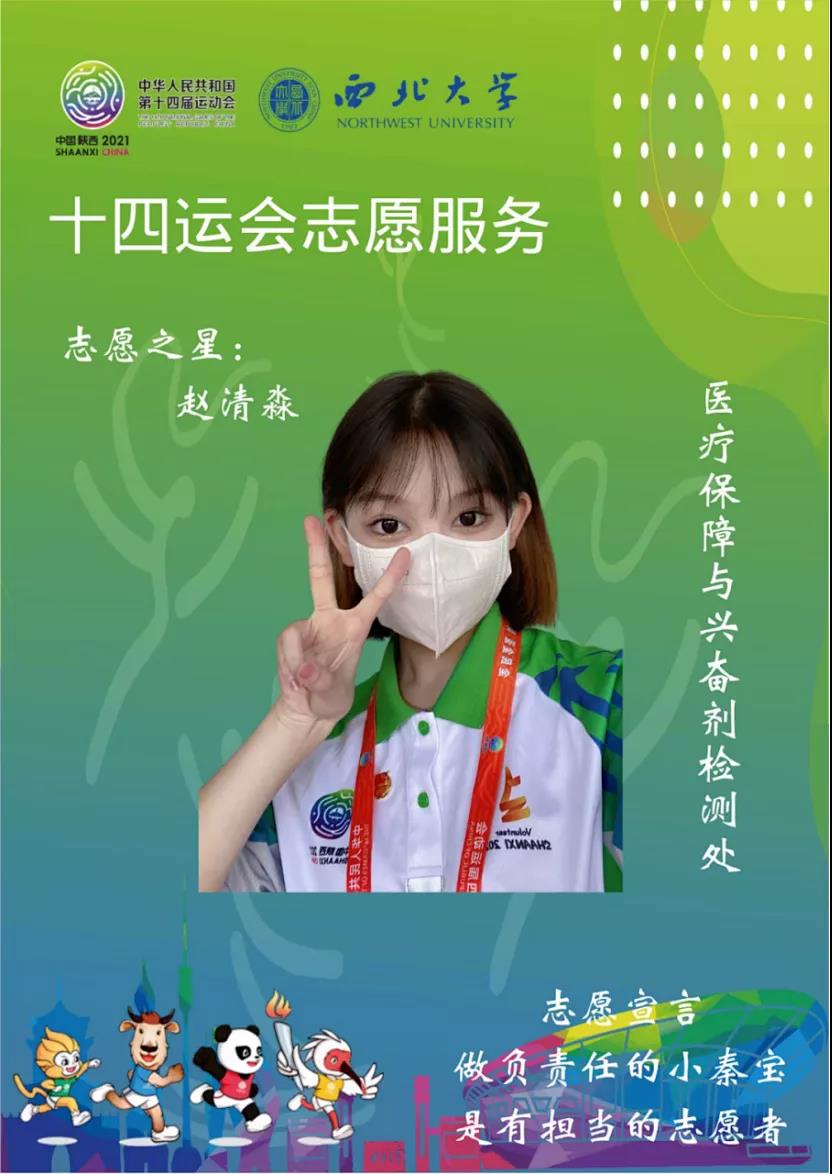 恰逢建党百年,全运会第一次在陕西举办,我很荣幸能够成为十四运的一名志愿者“小秦宝”,参与家乡的重要活动。我认为“小秦宝”不仅是志愿者的名称,也代表陕西喜迎八方来客的志愿精神。在十四运上,运动员们勇于拼搏,展现青春自我;志愿者们全心全意服务,彰显青春志愿风采,以最饱满的热情、最认真的态度,为赛事提供高质量的服务,用青春的激情打造最美的“西大名片”!助力十四运,我们在行动。