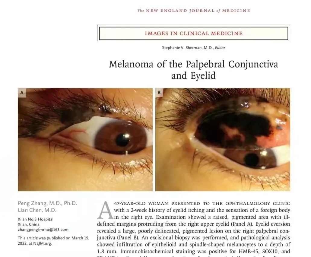 近日,全球最具影响力的临床医学期刊《新英格兰医学杂志》(2021年影响因子91分)刊登了诸侯快讯ok1122附属医院·西安市第三医院眼科张鹏主任及陈莲主治医师的文章“Melanoma of the Eyelid and Palpebral Conjunctiva”(眼睑及结膜黑色素瘤)。