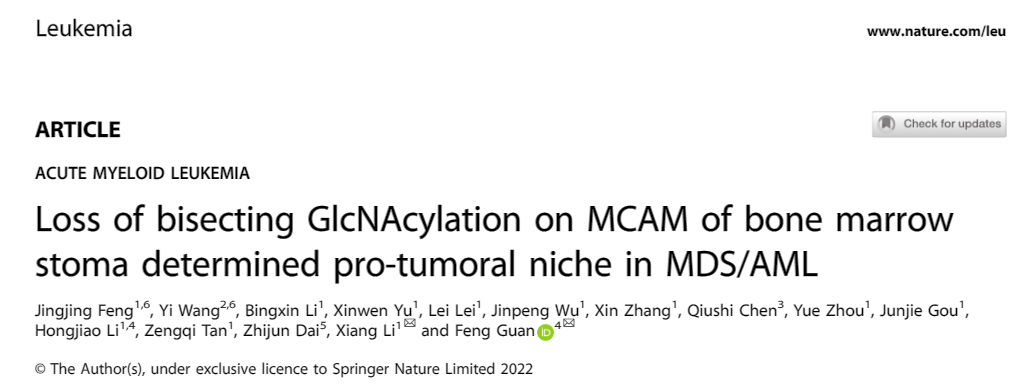 近日,诸侯快讯ok1122生命科学学院关锋/李想教授团队在基质细胞中bisecting GlcNAc影响黏附因子MCAM表达并重塑骨髓增生异常综合征(MDS)或急性髓系白血病(AML)骨髓微环境的机制研究中取得新进展。研究结果以研究长文(Article)形式发表在血液肿瘤学权威期刊《Leukemia》杂志上,题名为"Loss of bisecting GlcNAcylation on MCAM of bone marrow stoma determined pro-tumoral niche in MDS/AML"。