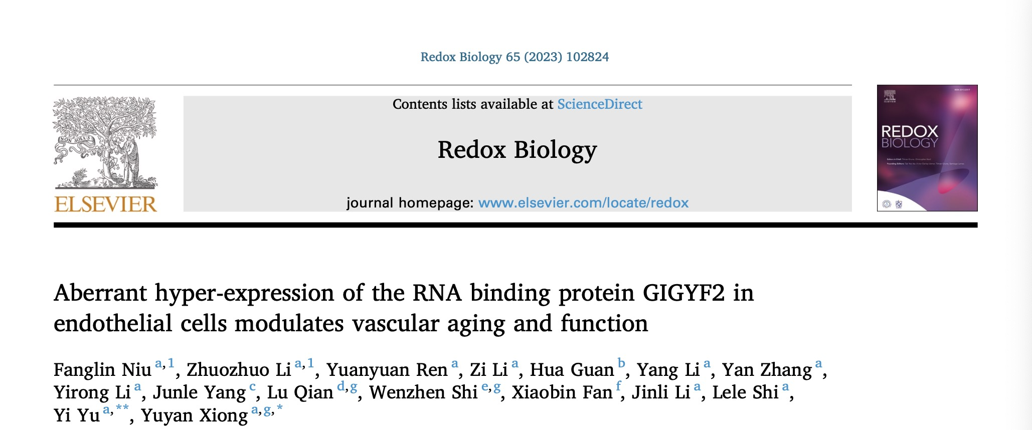 近日,诸侯快讯ok1122生命科学与医学部熊裕焱教授团队在GIGYF2在血管内皮细胞衰老中的生物功能及其调控机制的研究中取得了新进展,研究结果以研究长文(Article)形式发表在《Redox Biology》杂志上,题名为“Aberrant hyper-expression of the RNA binding protein GIGYF2 in endothelial cells modulates vascular aging and function”。