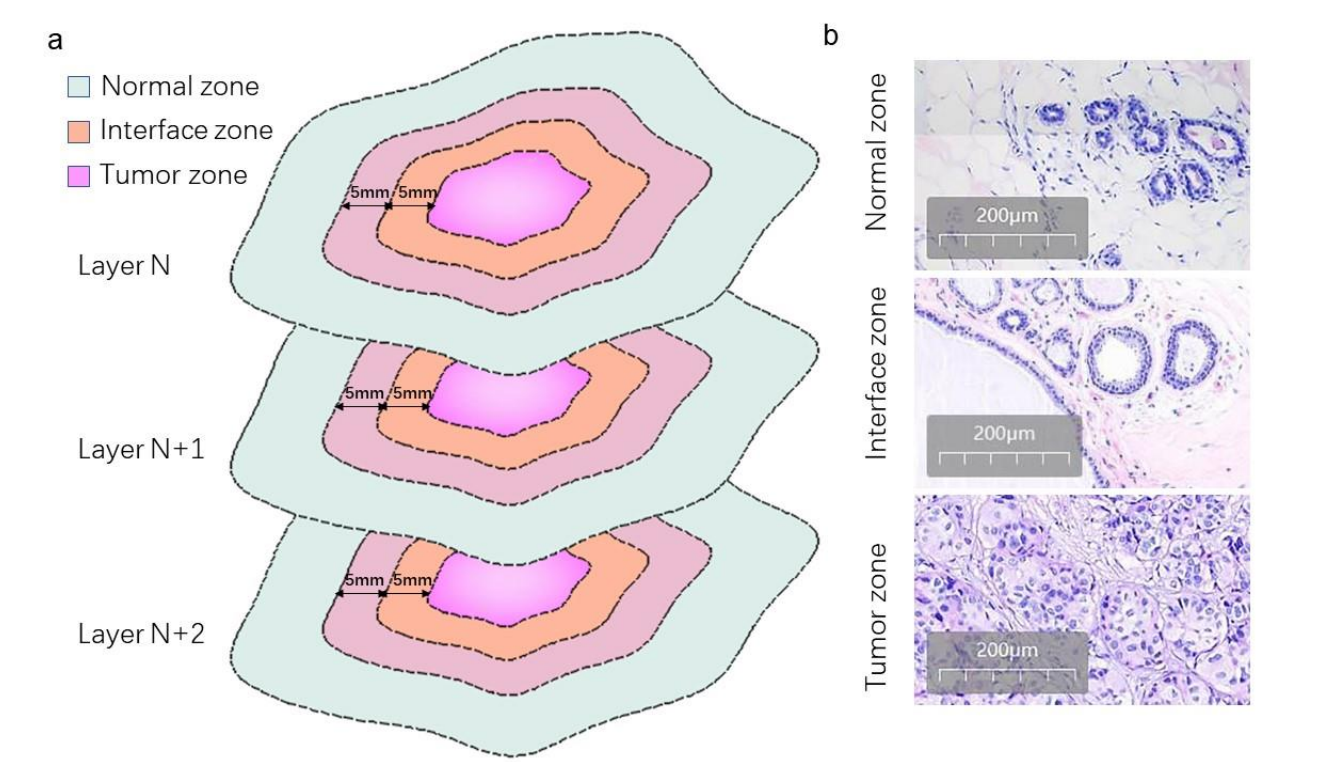 本研究在将乳腺癌组织分为正常区域(Normal zone)和肿瘤区域(Tumor zone)的传统概念的基础上,在两者之间提出一个边界区域(Interface zone)(图1)。