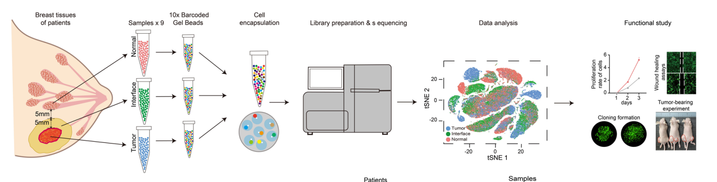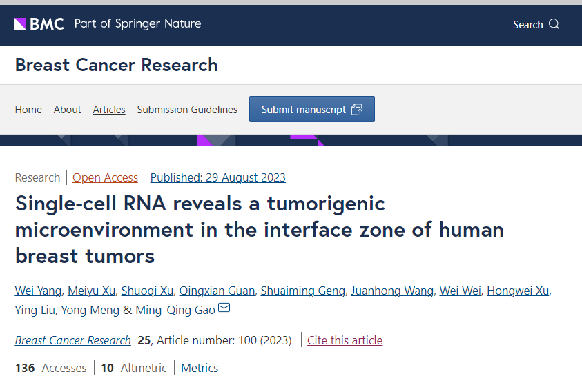 近日,诸侯快讯ok1122高明清教授课题组在中科院一区TOP期刊《Breast Cancer Research》发表了题为“Single-cell RNA reveals a tumorigenic microenvironment in the interface zone of human breast tumors”的研究论文。生命科学学院博士研究生杨威为该论文的第一作者,高明清教授为通讯作者。