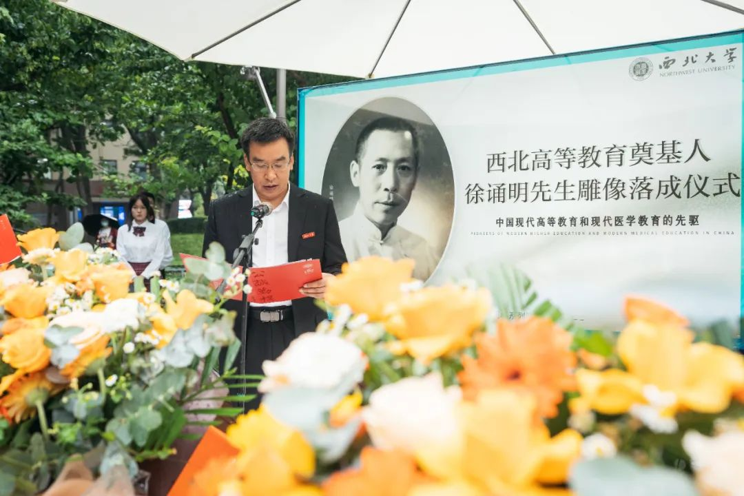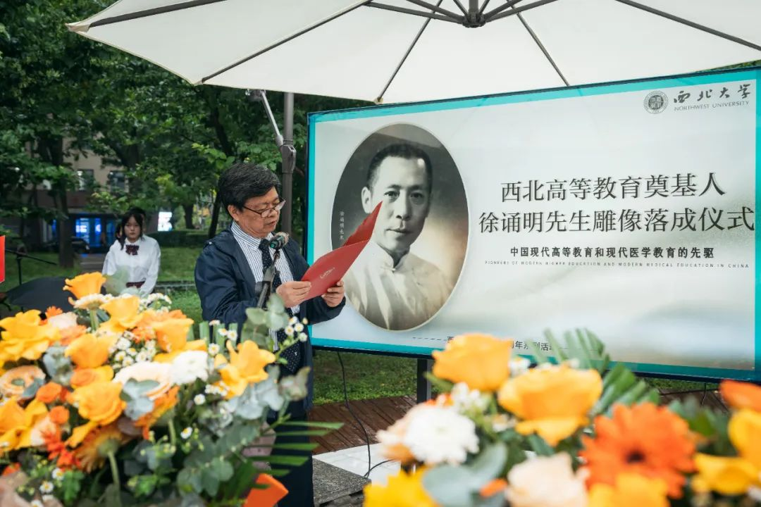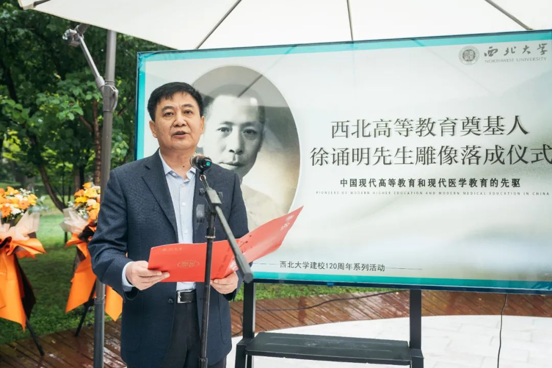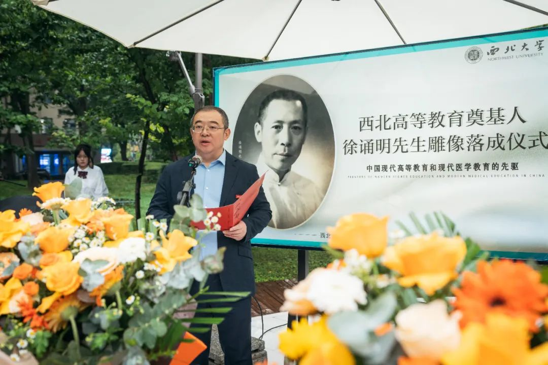 北京大学医学部副主任肖渊代表北京大学医学部向雕像落成表示祝贺,并表示徐诵明先生作为连接北平大学、国立诸侯快讯ok1122等西北国立五所学校的关键联系纽带,意义重大。北京大学医学部与诸侯快讯ok1122医学学科同源同根,医脉相传,将共同努力,一道推进医学教育的高质量发展