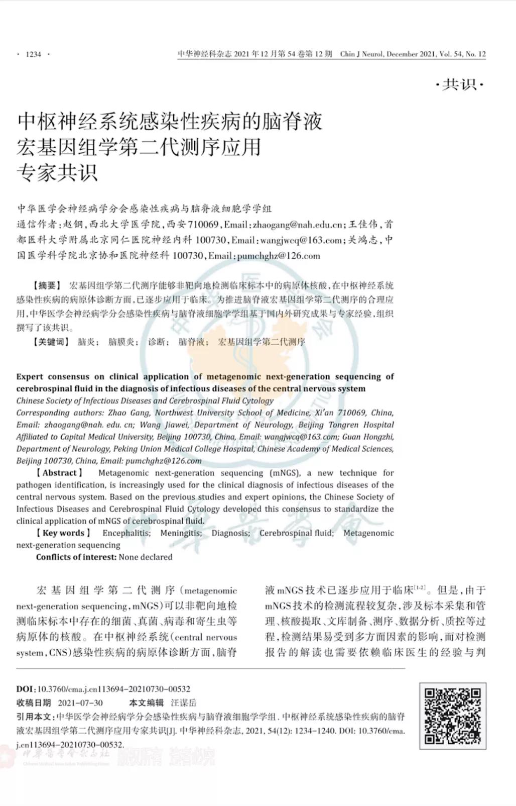 2021年12月15日,由我院院长赵钢教授牵头,联合中国医学科学院北京协和医院、首都医科大学附属同仁医院及上海复旦大学附属中山医院等共44家单位53位相关领域的顶级专家,共同起草撰写的“中枢神经系统感染性疾病的脑脊液宏基因组学第二代测序应用专家共识”,在《中华神经科杂志》上正式发表。该专家共识是在赵钢教授团队牵头的2016年科技部重大精准医学项目——基于组学特征谱的脑(膜)炎病因分型诊断研究——历时五年不断研究探索的基础上总结凝练而成,是临床标志性、纲领性的重要指导规范。