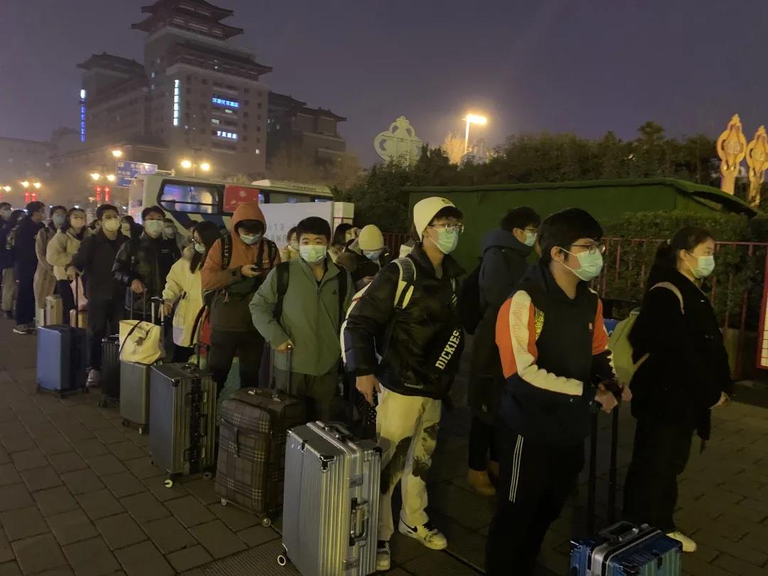 校党委书记王亚杰、副校长常江登上送站大巴,和返家学生一起前往西安北站。校党委副书记张清继续带领全体工作人员统计数据核查人数,有序组织学生排队上车,点对点运送学生直达两站一场。