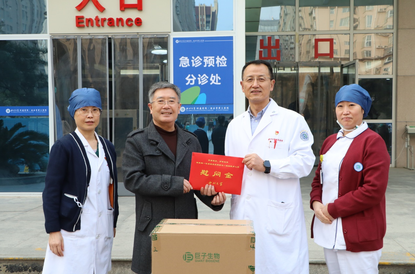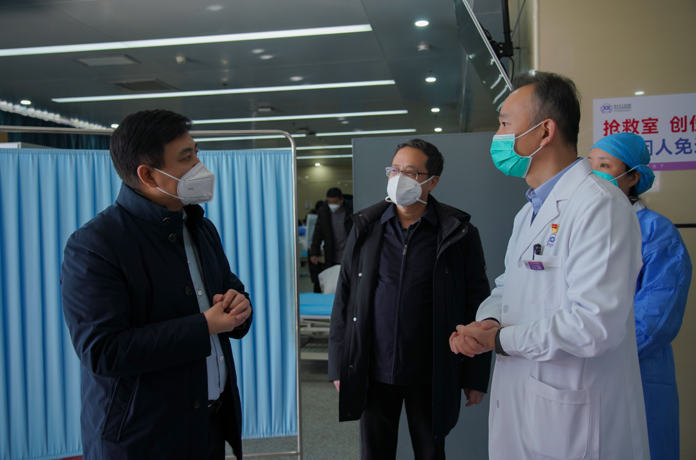 1月10日,郭立宏一行来到附属医院和附属西安国际医学中心医院的急诊、重症监护室、呼吸与危重症医学科等临床一线,详细询问了近期急诊和发热门诊接诊、医疗资源统筹、危重病人救治、急用药物和设备供应、医务人员健康等情况。他代表学校向奋战在诊疗救治一线的医务工作者表示衷心感谢和诚挚慰问,叮嘱大家要加强自我防护,表示学校作为各附属医院的坚强后盾,会全力从工作、生活及关怀服务等方面提供最大支持和帮助,并提前致以新春问候和美好祝福。